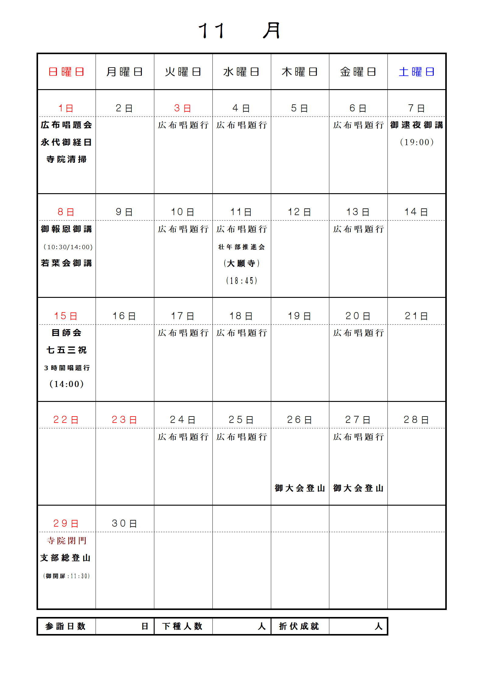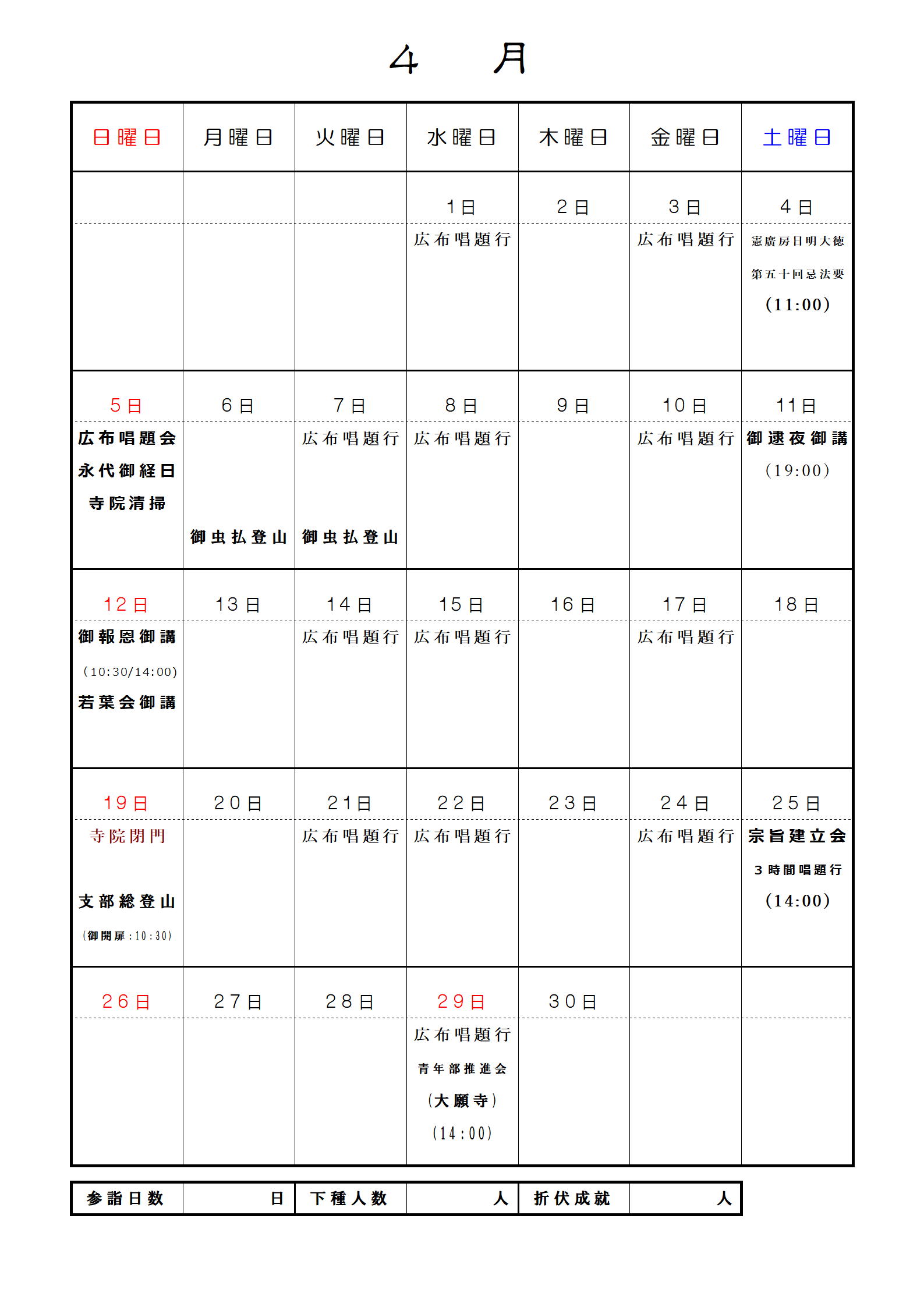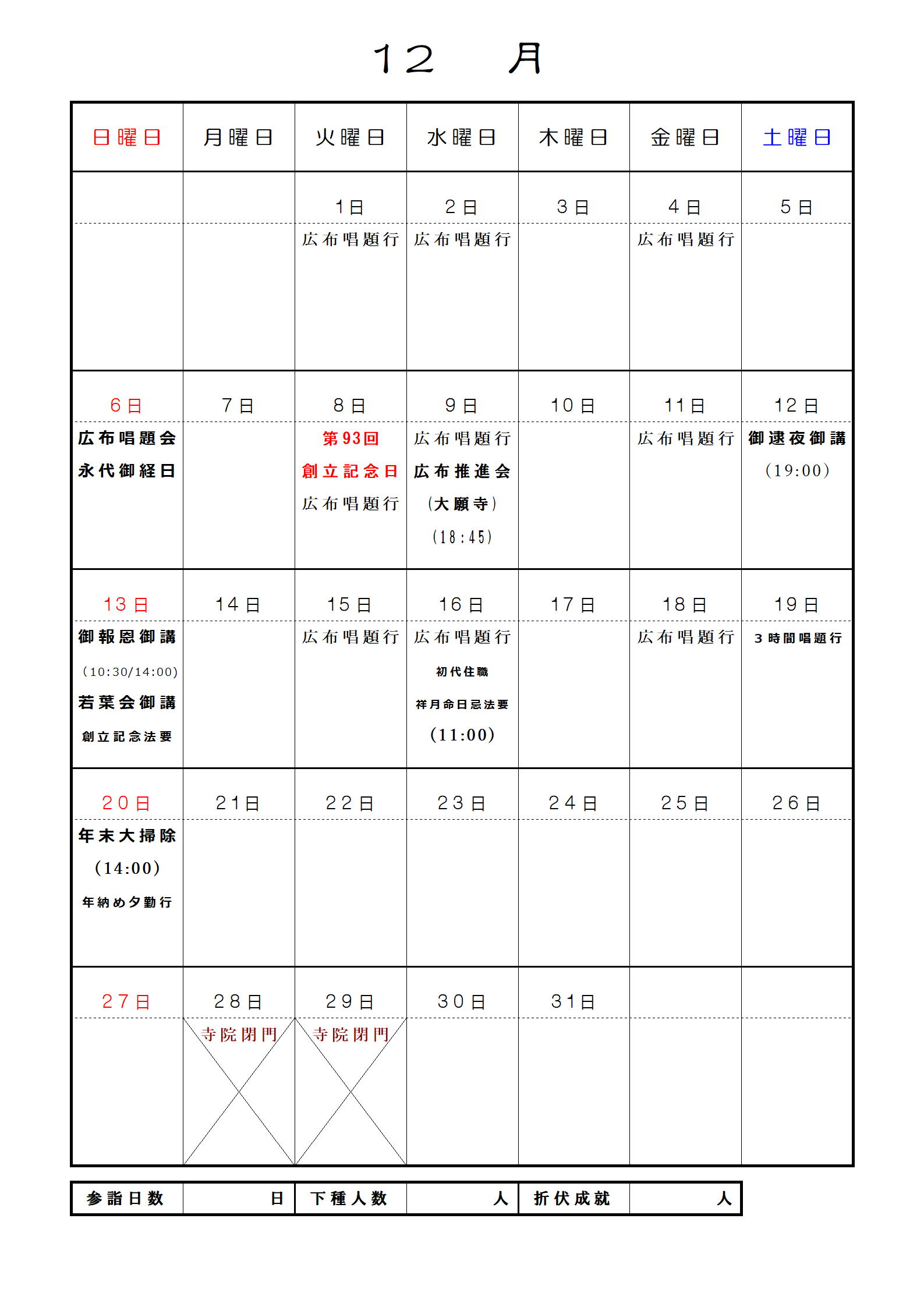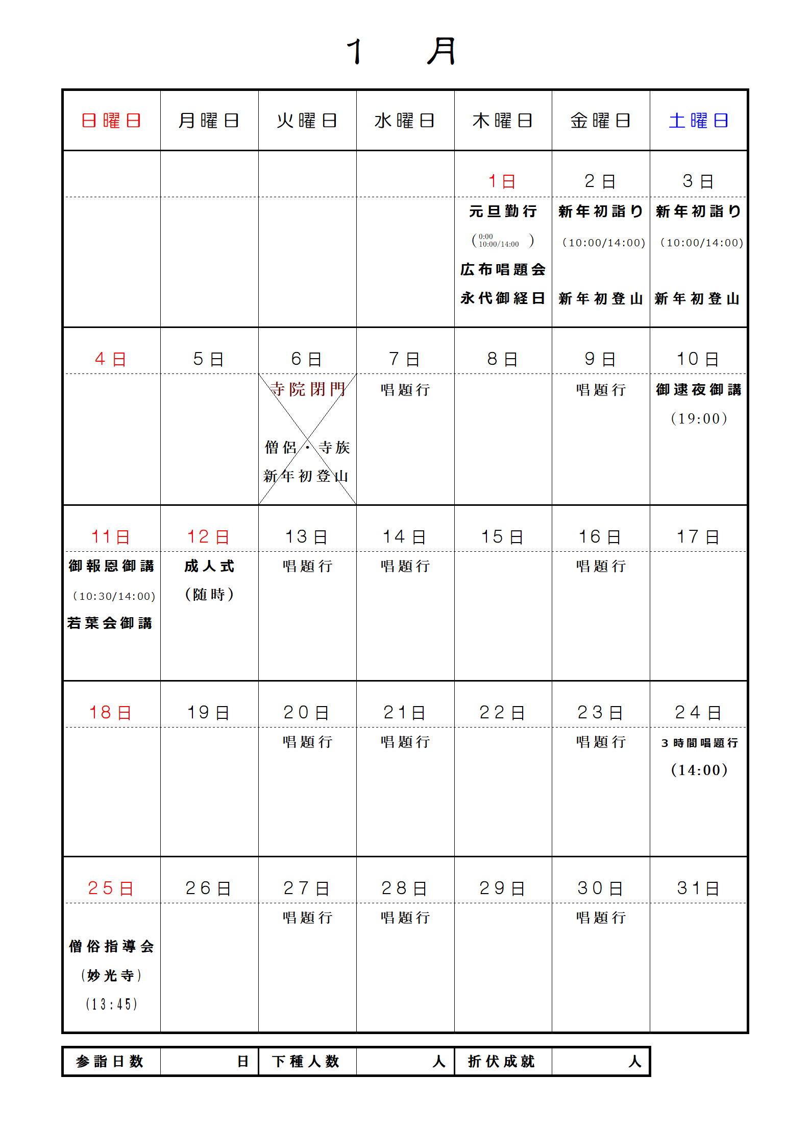 妙眞寺月間予定表